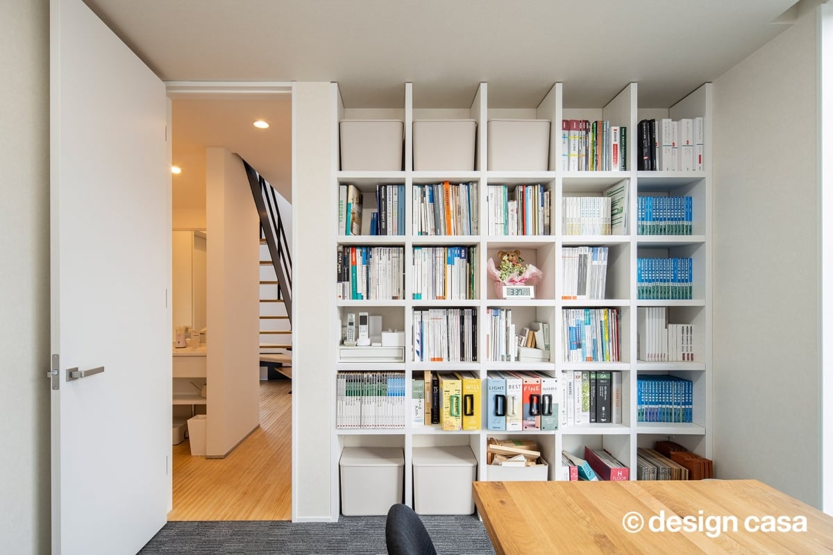 オフィススペースは、片面に天井いっぱいまでの造作棚を設置し、資料や書籍の収納に配慮したデザイン。打ち合わせの際にも、必要な資料をすぐに取り出せる機能的な空間です。大きな窓からは自然光が差し込み、コンパクトながらも明るく開放的な雰囲気を実現しています。