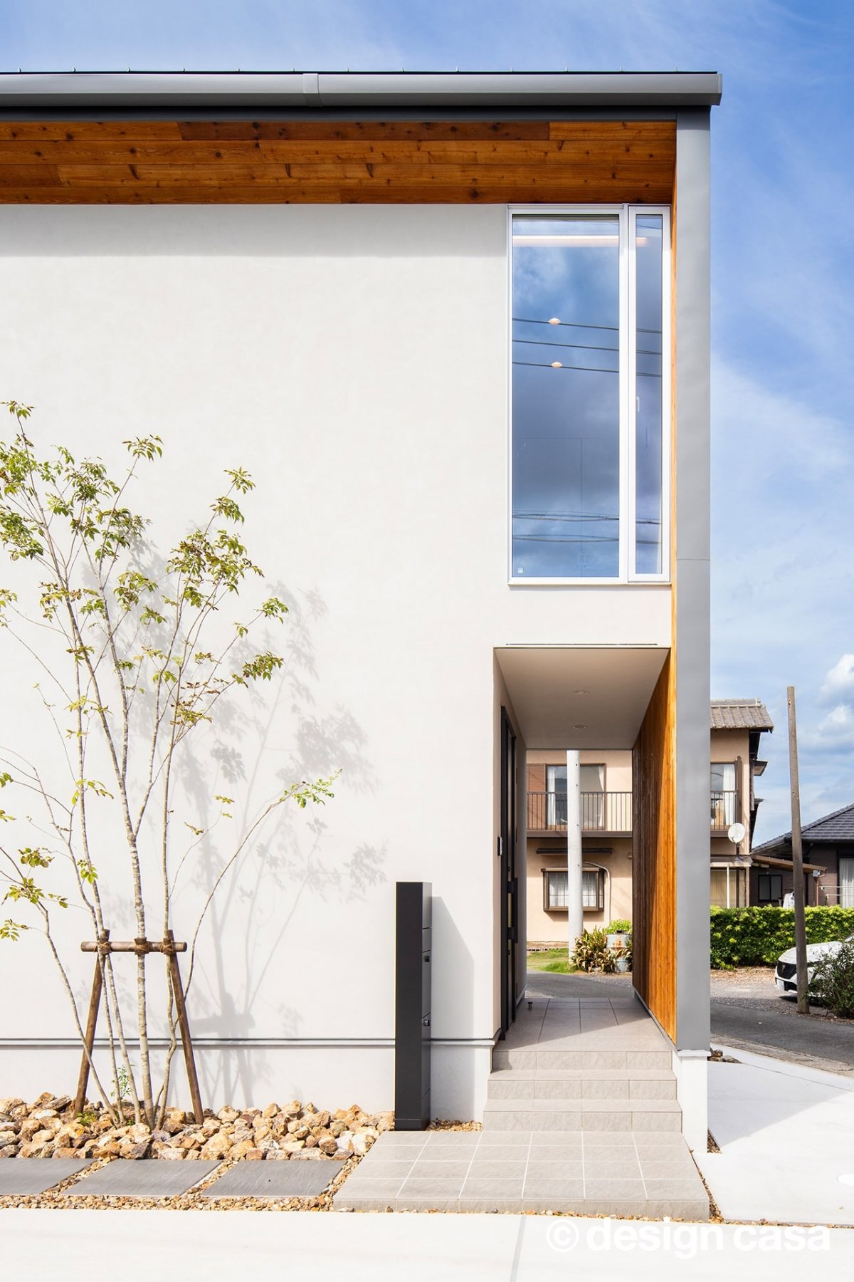 建物の外観は、ホワイトの箱型フォルムにコの字型の平面が組み合わされたシンプルかつ洗練されたデザイン。