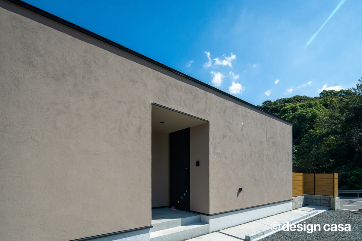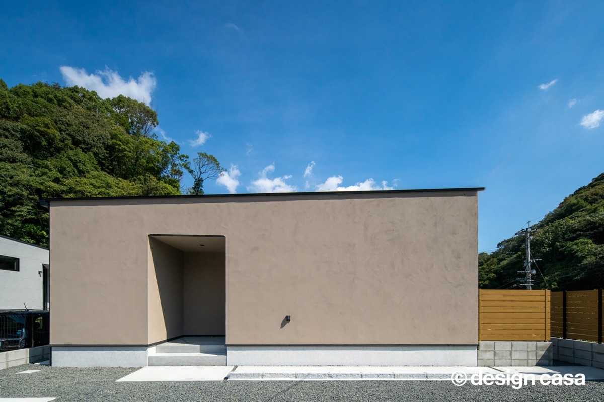 都市部から少し離れた場所にある平屋建ての一軒家は、ナチュラルなアースカラーの外観で見ている人もオーナー様ご家族も落ち着く気持ちにさせてくれます。