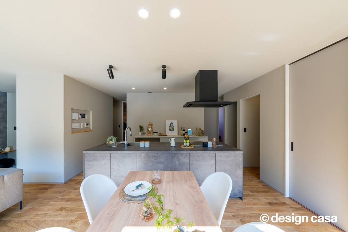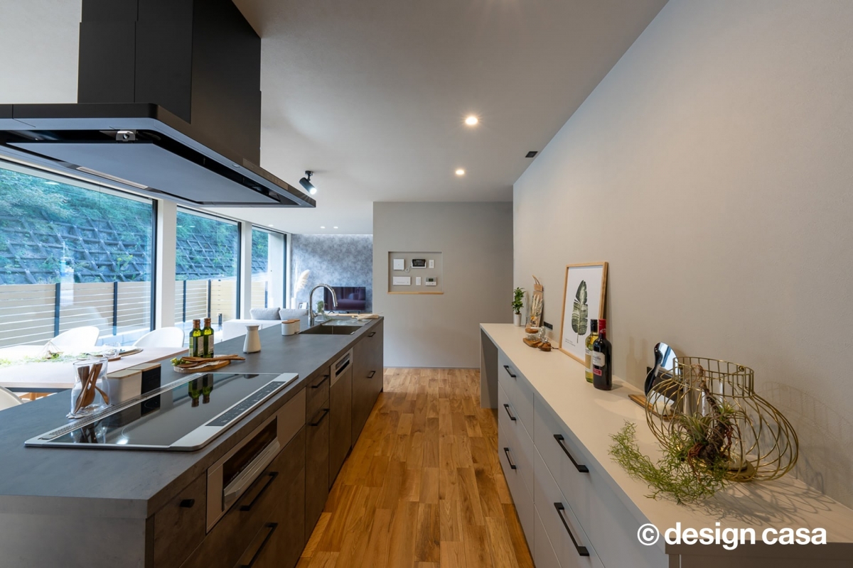 シックな色味のダイニングキッチンからはリビングと庭を両方眺められるので家事をしながら家族の様子を見守ることができて安心です。家事動線の取りやすさも理想のマイホームを建てる上では欠かせない要素となっており、オーナー様のこだわりのひとつです。