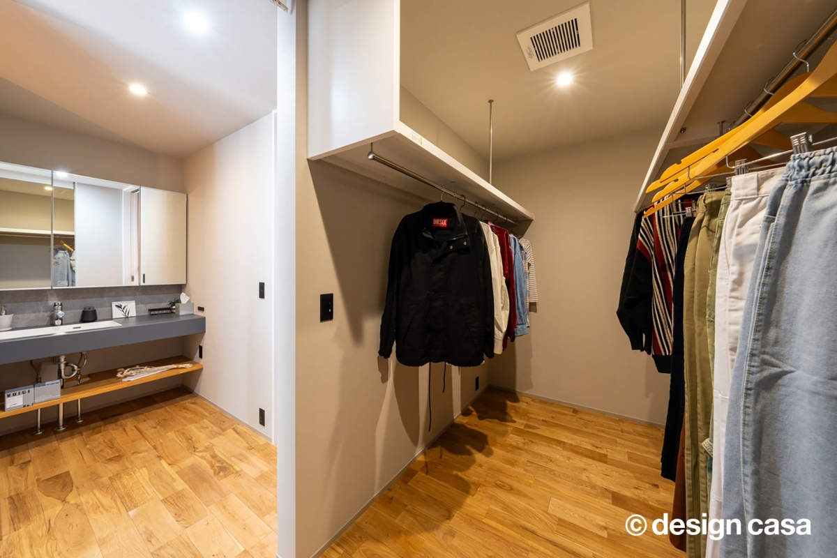 家事動線のみならず生活動線の取りやすさも家を建てる上では重要なポイントです。オーナー様こだわりのウォークインクローゼットのすぐ横には洗面台があり、服を着替えてすぐに洗面台で身支度を整えられる無駄のない動線を取ることが可能となっています。