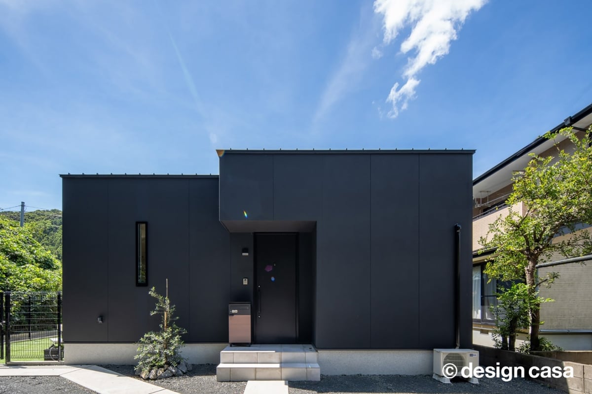 シンプルで無駄のないフォルムは、建築家の視点だからこそ生まれた造形美。装飾に頼らず、構成と素材で魅せる外観は、ひと目で強く印象に残ります。あまり開口部のない壁面に、わずかに設けられた細長い窓が、空間への期待感をかき立てます。外に対しては「閉じる」ことでプライバシーを確保し、内に入ると一転、外とつながるような開放感が広がっています。