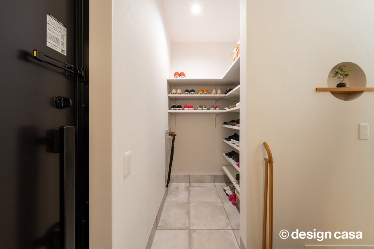 玄関を入ってすぐ左手には、靴をたっぷりと収納できるスペースを確保しています。日常的に使うものから季節の靴まで、すっきりと収められるのが特徴です。見せたくないものは隠し、出し入れしやすさはそのままに。靴だけでなく、傘ベビーカーなども整理できる設計で、家族のライフスタイルに寄り添う収納空間になっています。