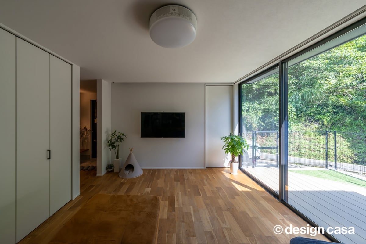 大きな窓があることで、どこにいても自然と外へ目が向きます。建築家は、景色の切り取り方や窓の高さ・位置にまで細やかな配慮を重ね、住む人が自然と視線を外に向けてリラックスできる空間を生み出しました。