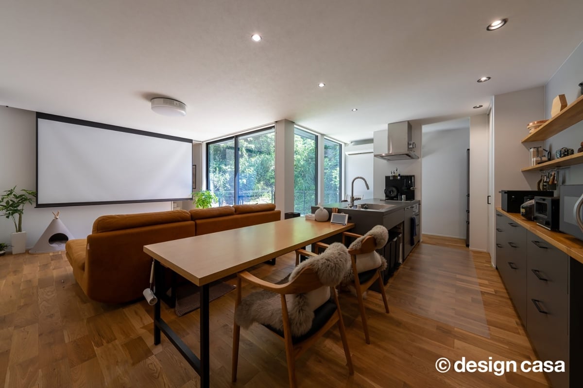 奥にはリビングとつながるスクリーンのある空間が広がり・食事をする場所・くつろぐ場所・楽しむ場所が一体となった暮らしの中心になっています。「日常」がいちばん心地よいと感じられる、そんな住まいです。