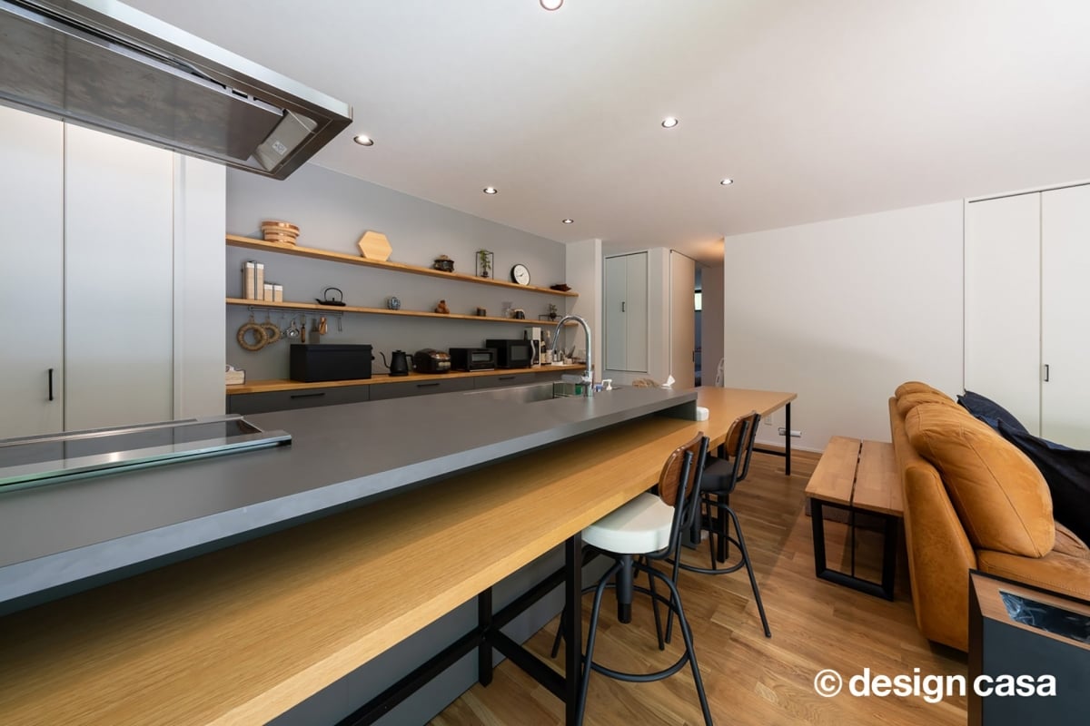 暮らしの中で、いつも自然と人が集まる場所、それがこのキッチンです。ゆったりと伸びるカウンターは、料理をする手元と家族の視線がつながるように設計されています。素材はグレーと木の組み合わせ。硬質さと温もりが同居するバランスが美しく、空間に落ち着いたリズムを生み出します。壁面にはオープン棚。見せる収納としてだけでなく、日々の道具が使いやすく整っていることが暮らしやすさにつながります。