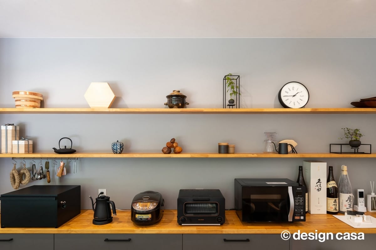 壁面は、日常的に使う炊飯器や調理器具さえも、空間を彩るインテリアの一部として美しく収まっています。ステンレスやセラミック、木など、素材感の異なるキッチンアイテムが並ぶ様子は、まるで静かな展示棚のよう。見せる収納としての美しさと、すぐ手が届く使いやすさを両立させた設計が、暮らしに整ったリズムをもたらします。