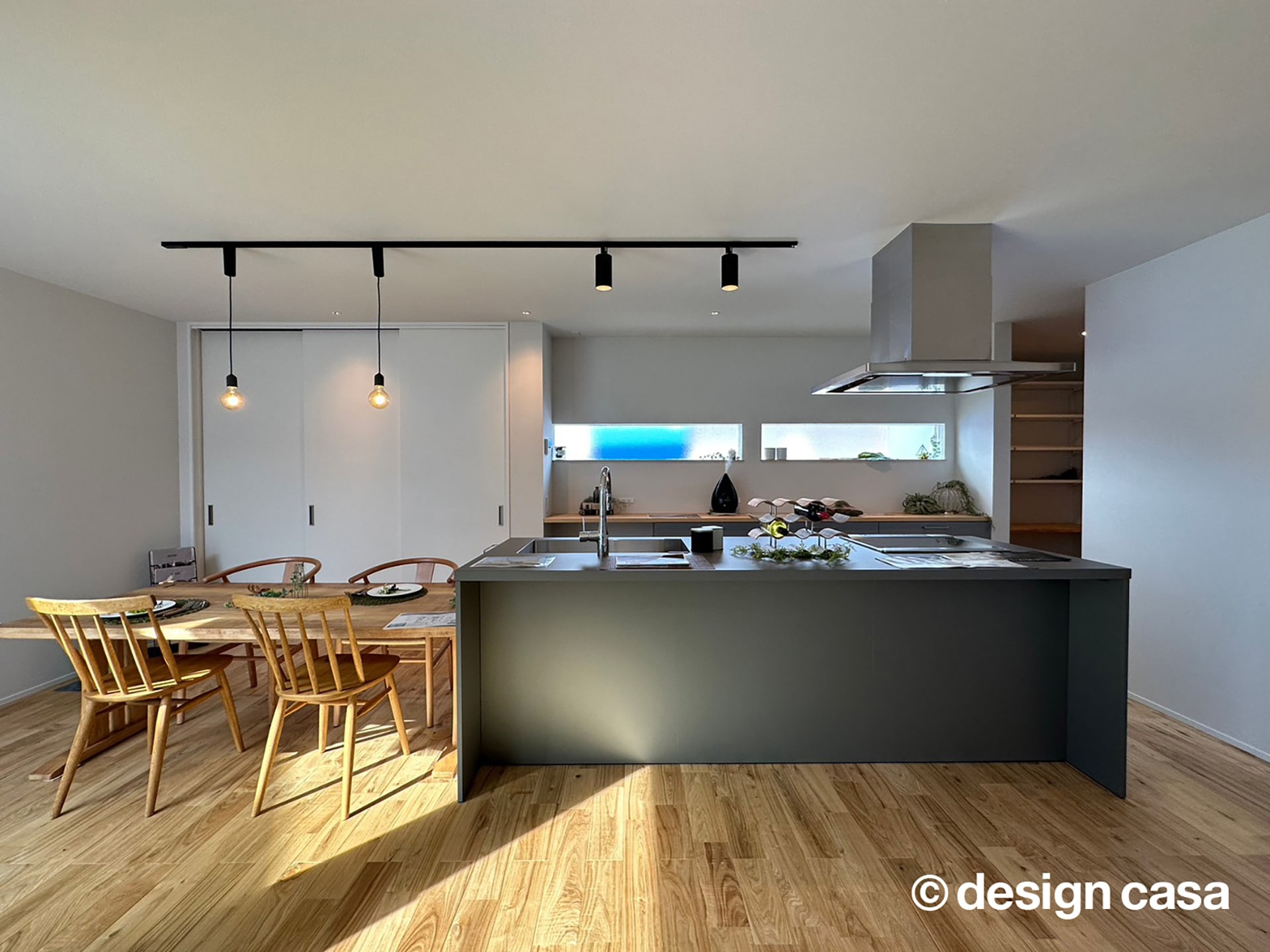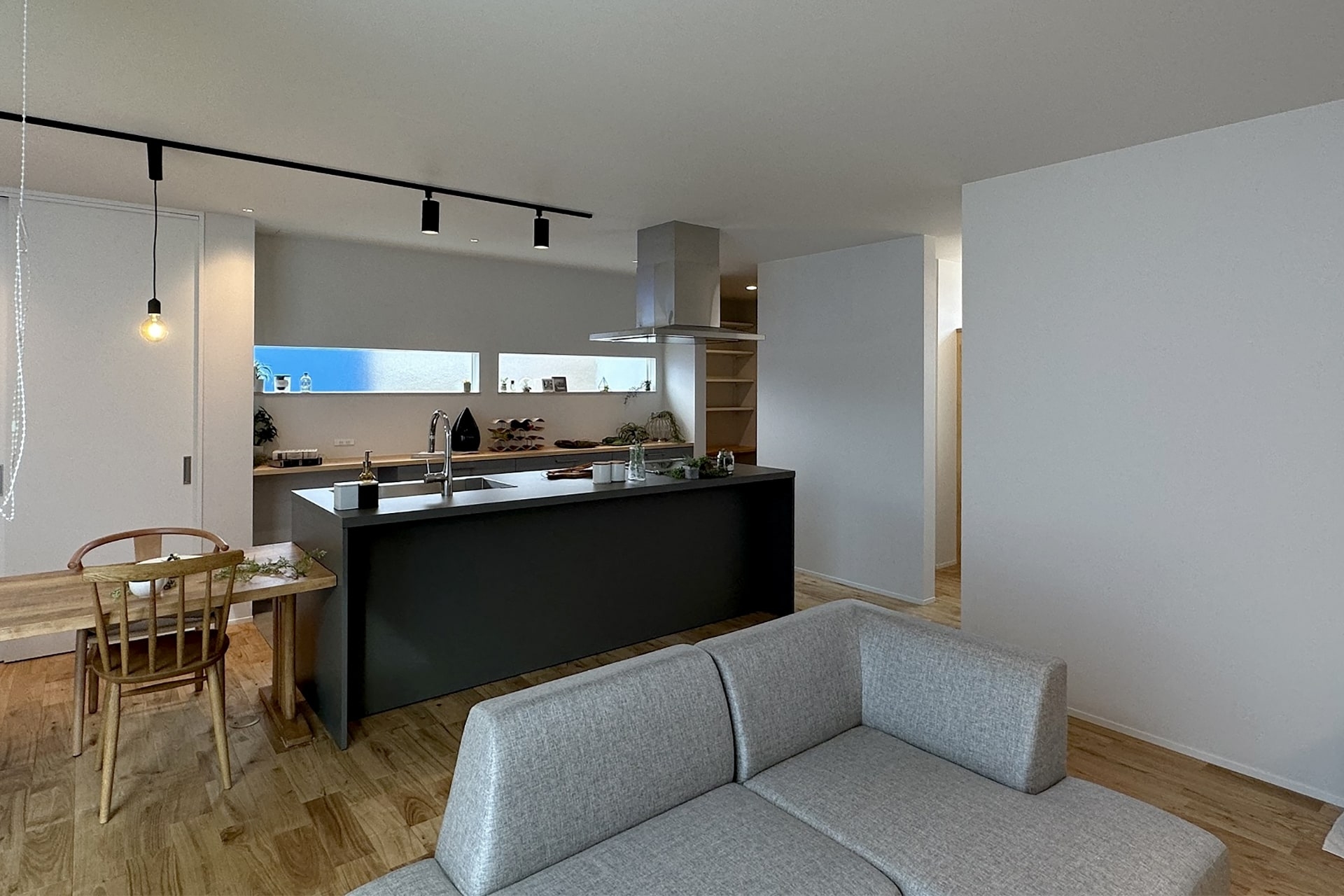 グレーを基調としたオープンキッチンは木目のダイニングテーブルと相性がよく、上品で落ち着いた空間を作り出しています。一直線に並ぶレイアウトは、料理をしながら家族と会話を楽しめるのが魅力です。シンプルでありながら温かみがあり、日常の食卓を豊かに彩ります。