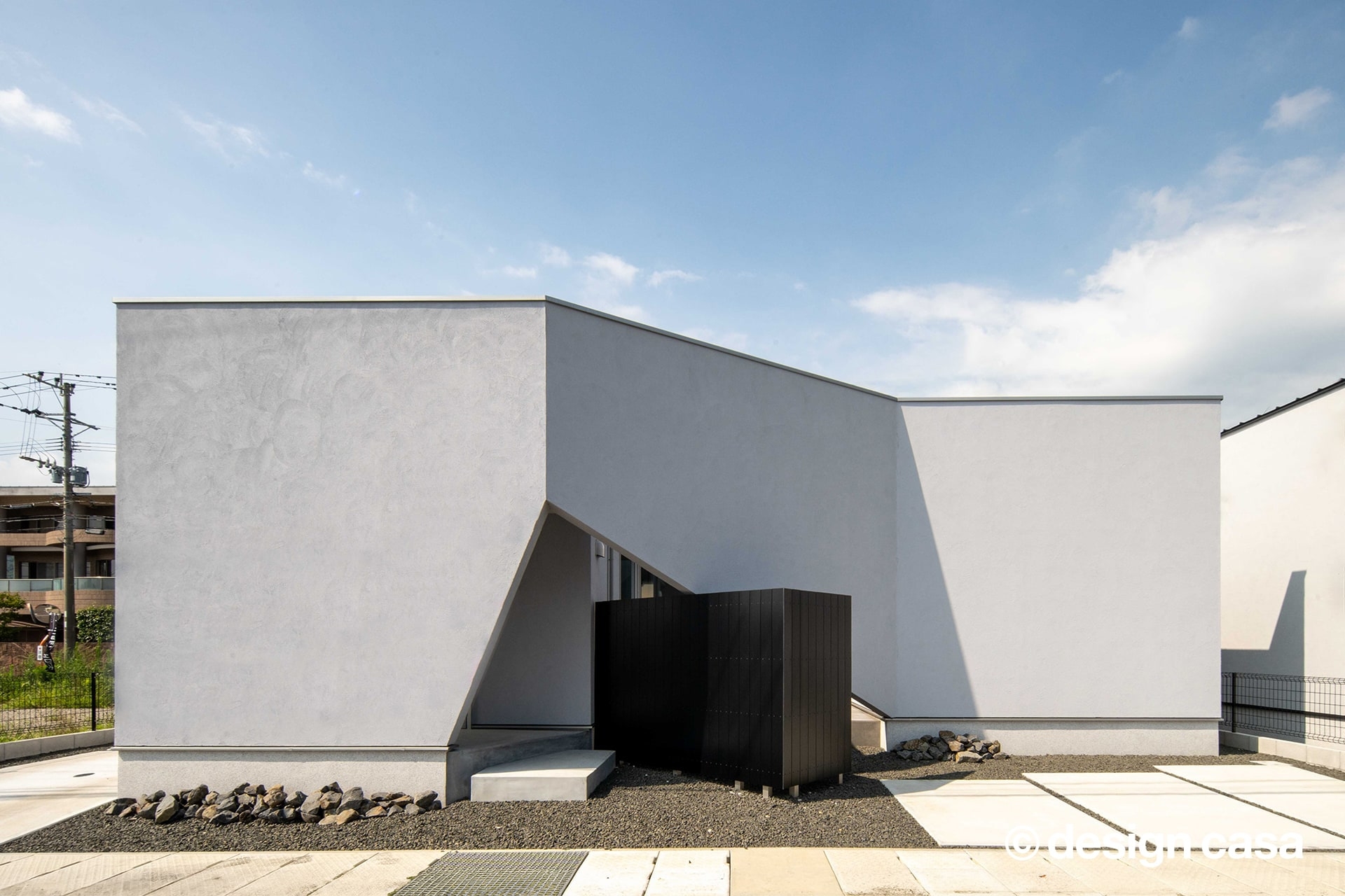 無駄を削ぎ落としたシンプルなフォルムが印象的な外観は、白を基調とした外壁に直線的なラインが魅力です。玄関まわりには奥行きと陰影が生まれ、外観に立体感をプラスしています。さらに、入り口を三角形にデザインすることで、ファサードにアクセントが加わり、独自の個性と洗練された印象を際立たせています。住まいの第一印象から上質さとオリジナリティを感じさせる住まいです。