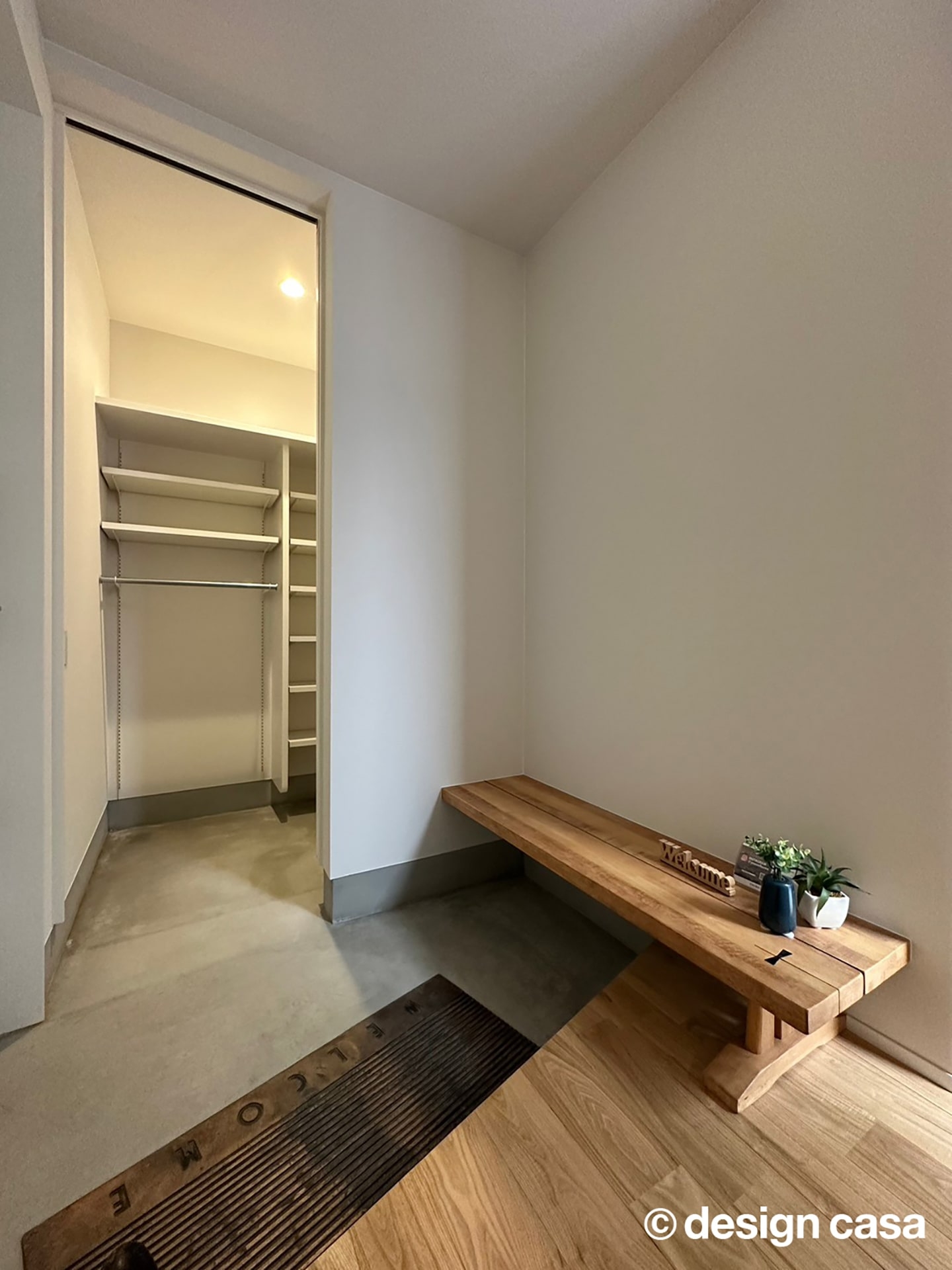 玄関は、ベンチのように使える木目の棚が設けられており、荷物を置くなどの実用性も抜群です。また、玄関の左手には、収納スペースがあります。靴や日用品をすっきりと収められるため、生活感を抑えつつ整った印象を保てるのが魅力です。木の質感が加わることで、温もりと親しみやすさが玄関全体に広がります。ゆとりある広さと開放感に包まれながら、毎日の外出や帰宅の時間を快適に過ごせる空間です。