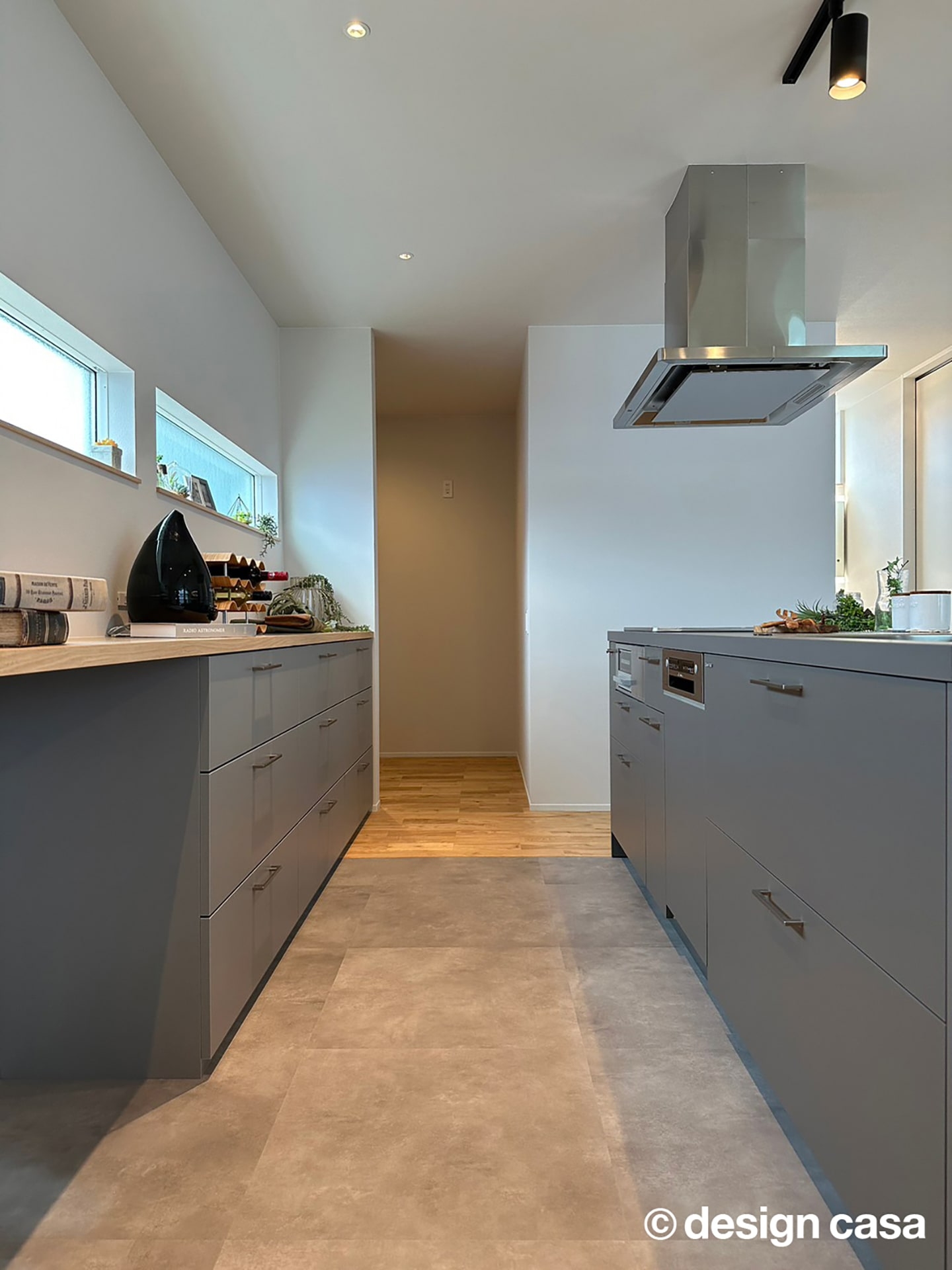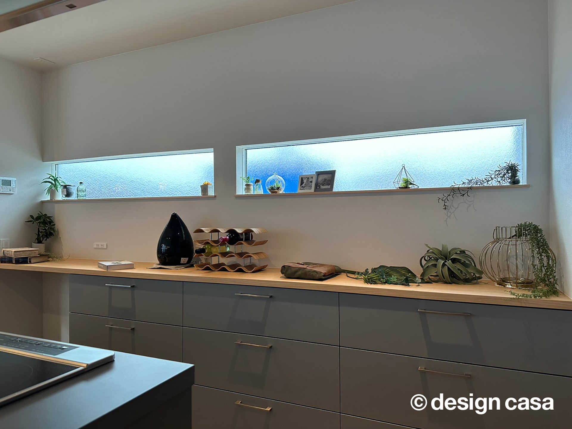 収納とカウンターが一体となったバックセットは、調理器具や小物をすっきりと整理でき、キッチン全体を美しく保てるのが特徴です。壁面には横長の窓が設けられ、自然光を取り込みながら、外からの視線を遮る工夫がされています。お気に入りの雑貨や植物をディスプレイすることで、暮らしに彩りを加えられます。