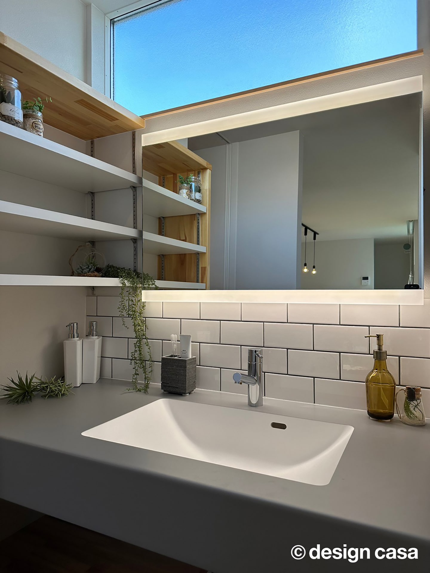 洗面所は、横長の窓ガラスから自然光がやさしく差し込み、明るく清潔感のある雰囲気が魅力です。鏡の上下にはライトが配されており、朝の身支度や夜のリラックスタイムに合わせて空間を優しく照らしてくれます。収納は白と木目を組み合わせ、シンプルでありながら温もりを感じさせるデザインが特徴です。