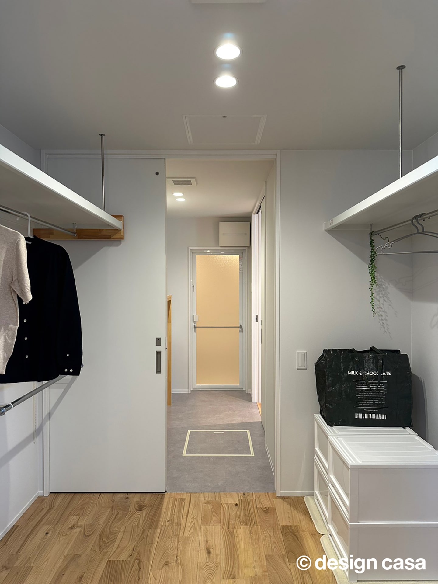 ウォークインタイプのクローゼットは、洋服や小物を効率的に収納できる広さを確保しています。通路の幅も十分にあり、衣替えや収納作業も快適です。また、引き戸で仕切られているため生活動線の邪魔にならず、日常的に使いやすい設計が特徴です。