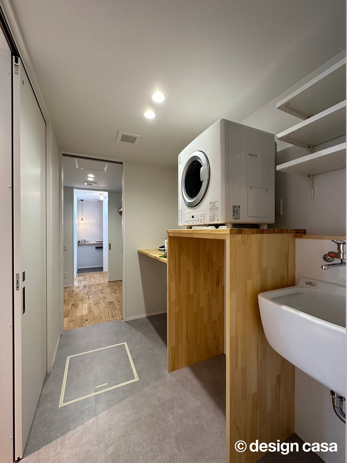 サニタリースペースは、生活動線を意識した実用的な設計です。洗濯機の設置スペースや作業台が効率よく配置されており、家事をスムーズにこなせます。また、木目のカウンターが加わることで、機能的でありながら温かみのある印象になります。さらに奥には収納棚も備わり、タオルや洗剤などをすっきりと収められます。毎日の暮らしを快適にサポートする、使い勝手とデザイン性を兼ね備えた空間です。