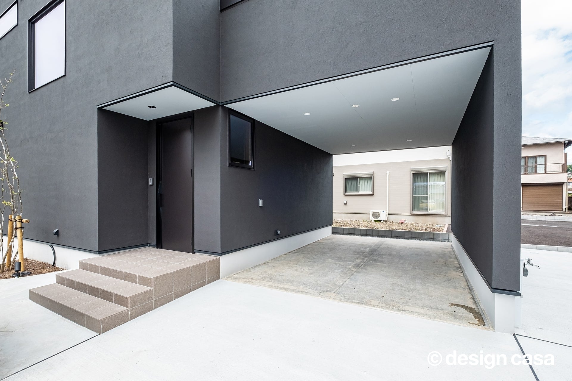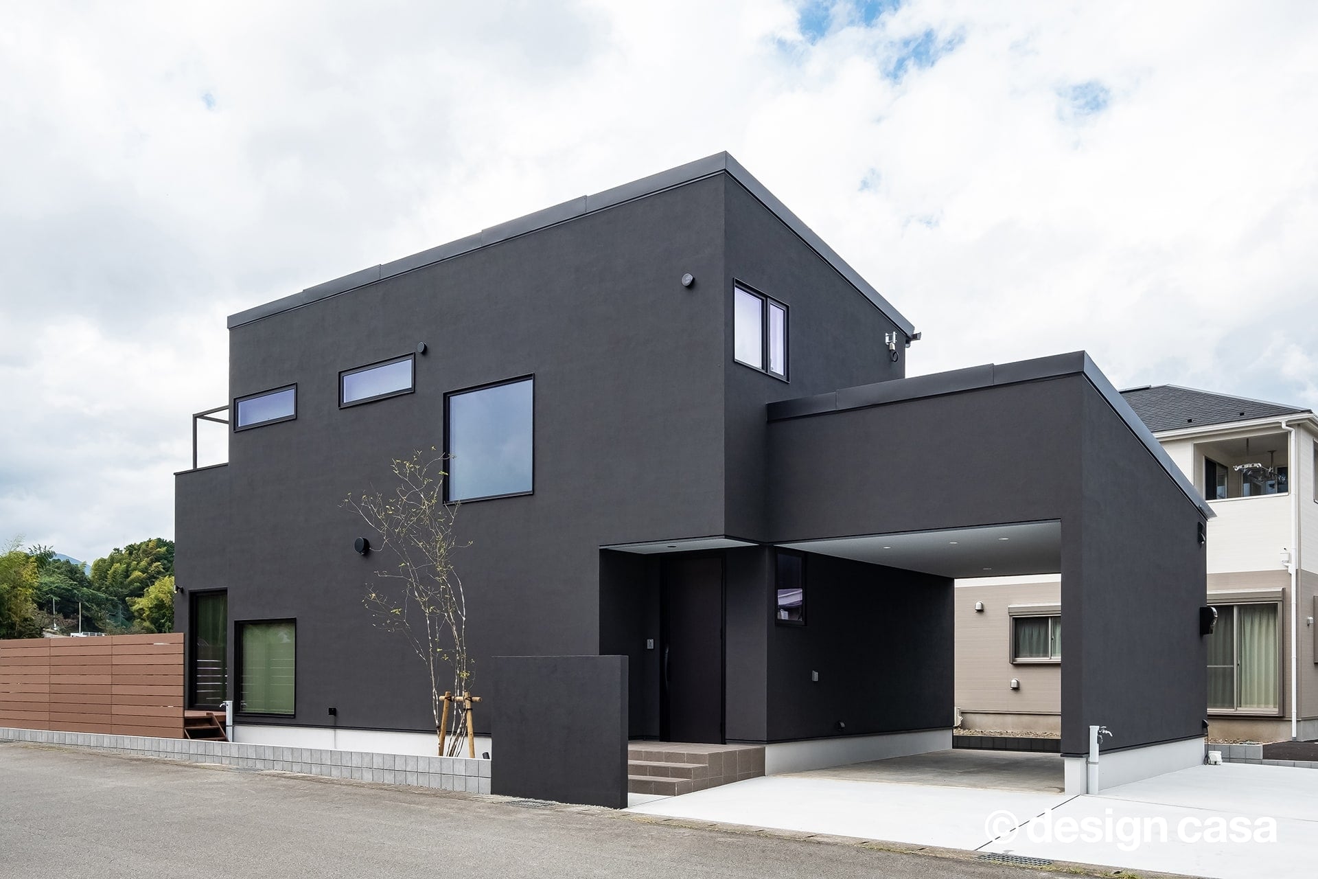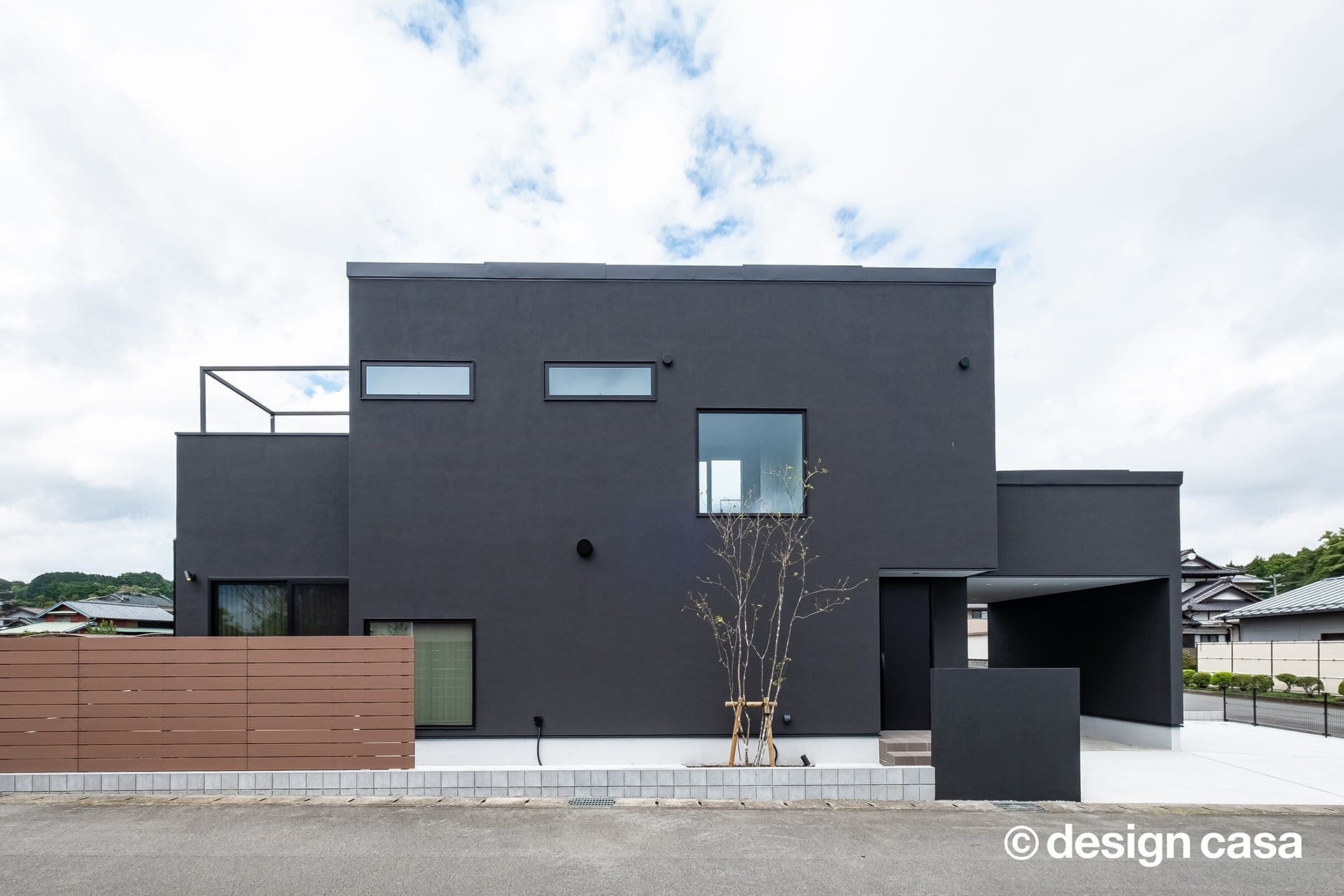 直線的なフォルムとダークトーンの外壁が印象的な外観は、建築家とともに計画。装飾を抑えたシンプルな構成でありながら、ボリュームの重なりや開口部の配置によって、単調さを感じさせない表情を生み出しています。角地という立地条件を活かし、周囲からの視線をコントロールしつつも閉鎖的にならないバランスを追求しました。町並みに溶け込みながらも存在感を放つ、長く愛されるような外観です。
