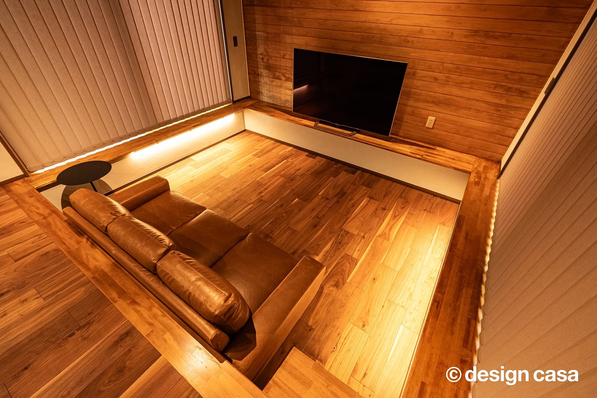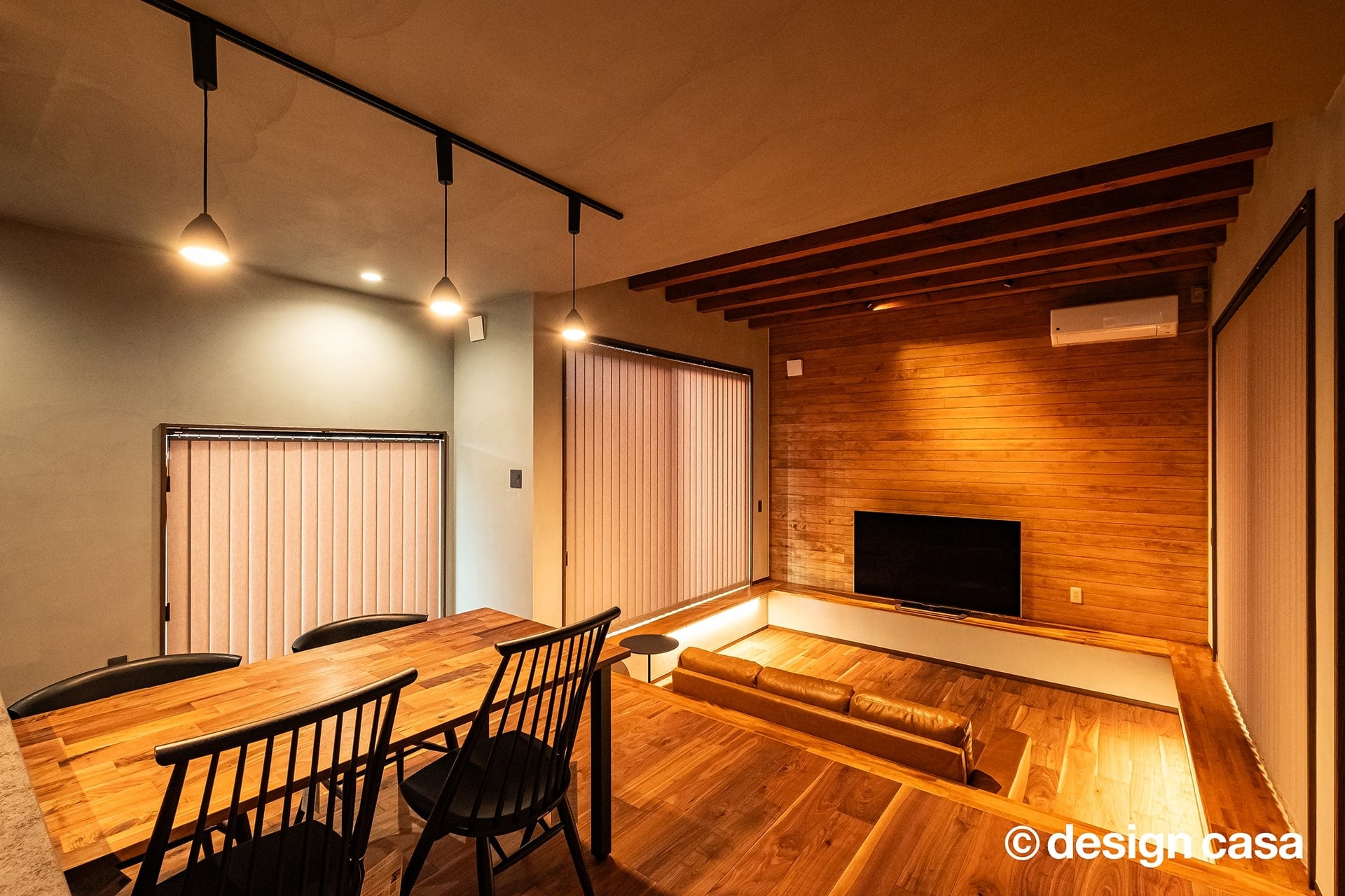 また、間接照明と木の素材感が重なり、夜には包み込まれるような温もりが空間全体に広がります。家族で過ごす時間も、一人で静かに過ごす時間も、どちらにも寄り添う空間です。
