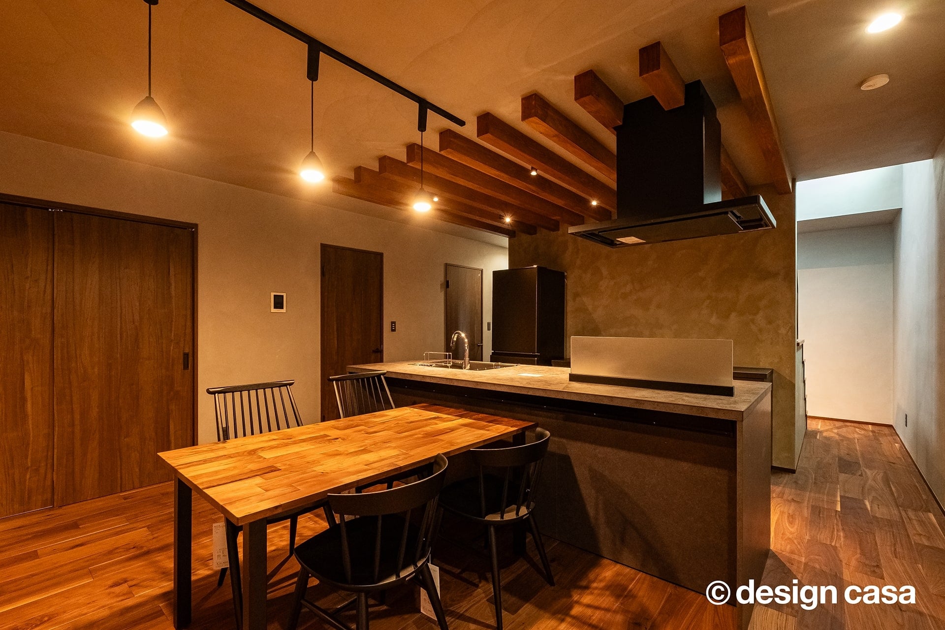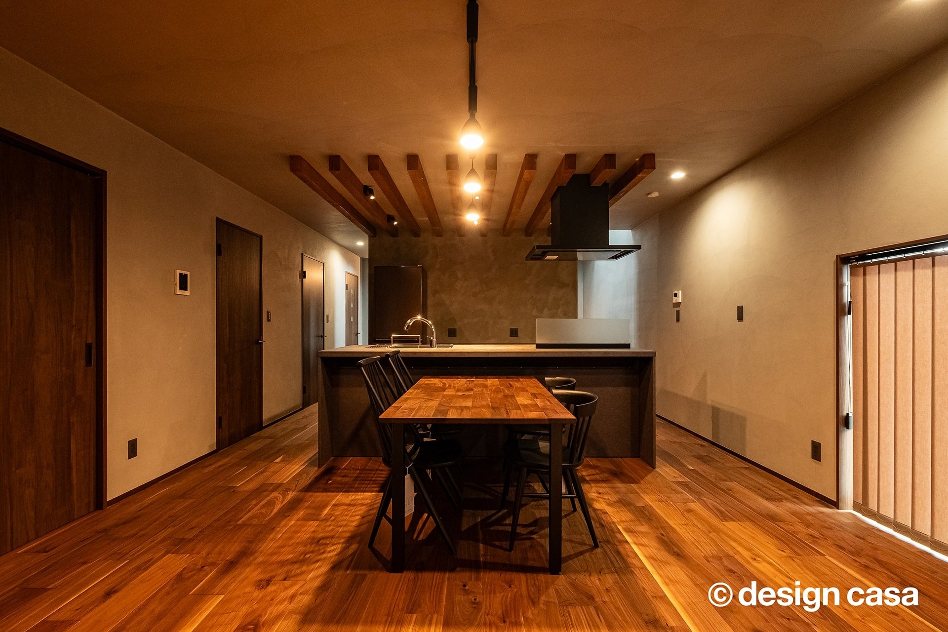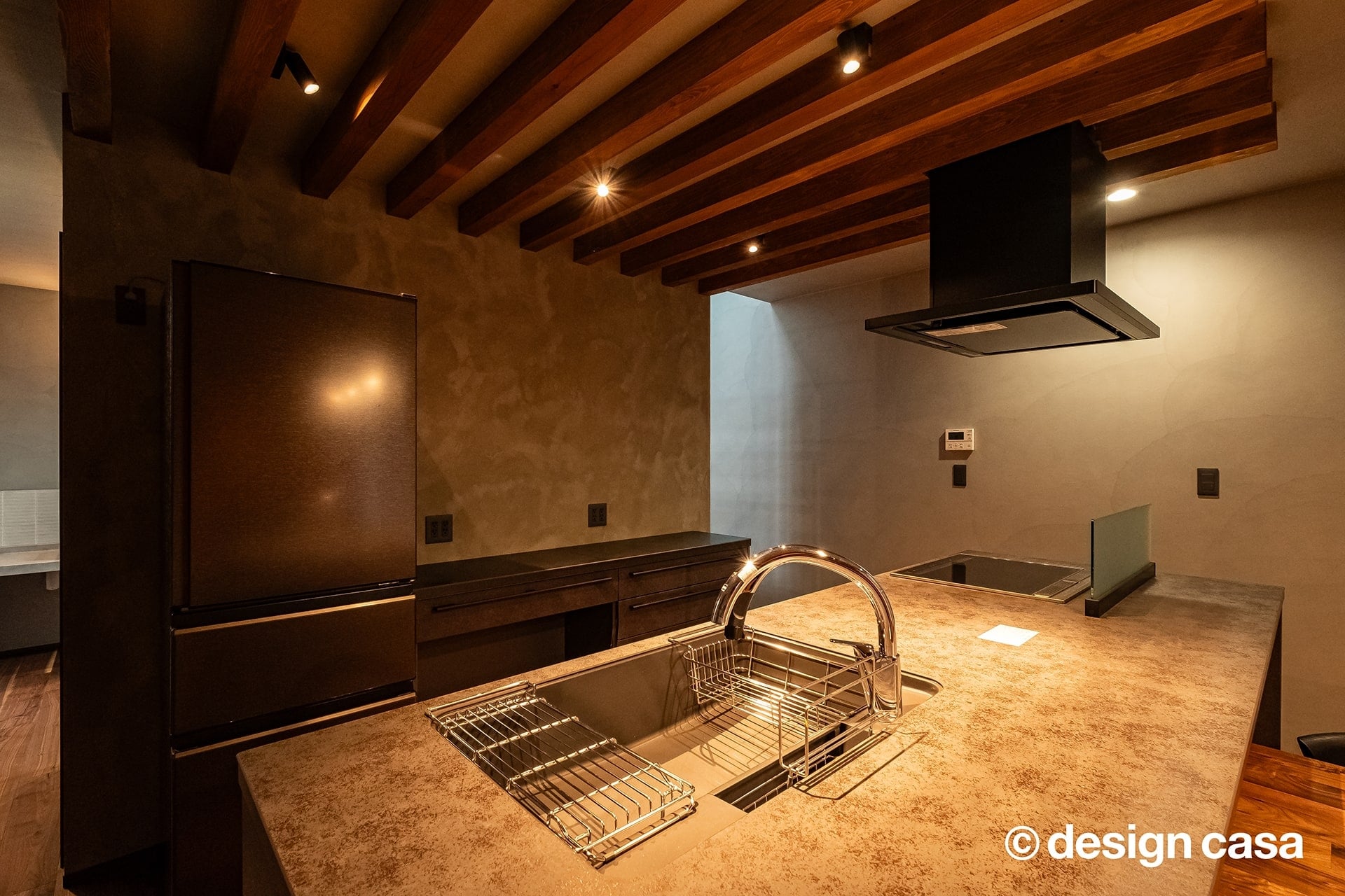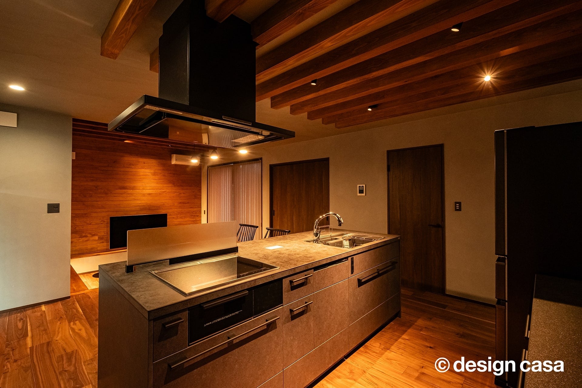 住まいの中心に据えたフラットキッチンは、建築家と動線や視線の抜け方を細かく検討し、設計しました。動線が良いレイアウトにより、調理・配膳・片付けがスムーズに行え、日常の動きに無理がありません。重厚感のある素材を使いながらも、天井の木梁や照明計画によって、冷たさを感じさせない空間に仕上げています。料理をする時間も、家族と過ごす時間の一部として自然につながるのが魅力です。
