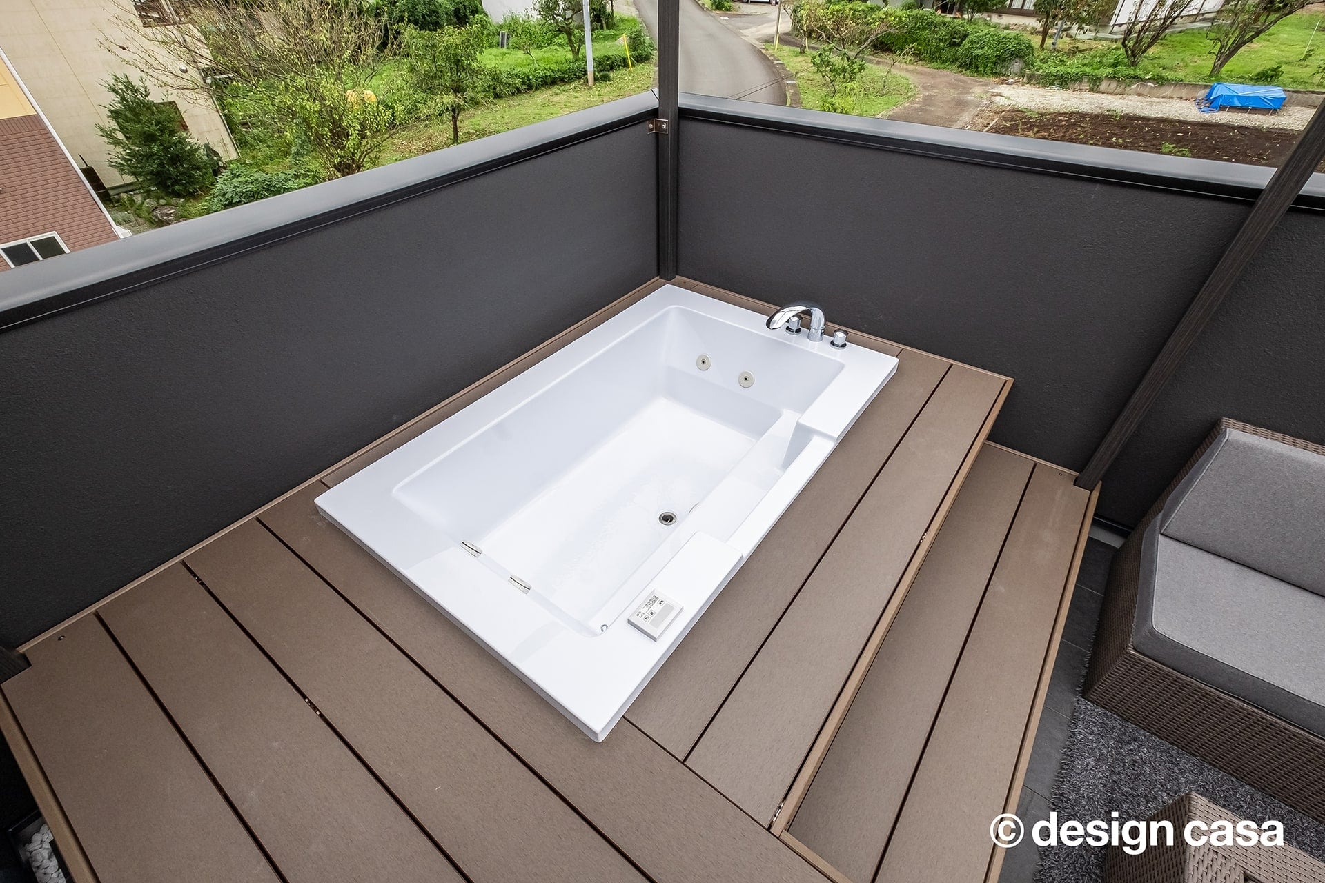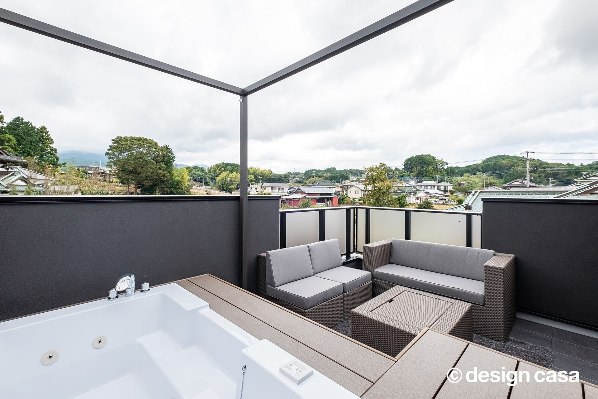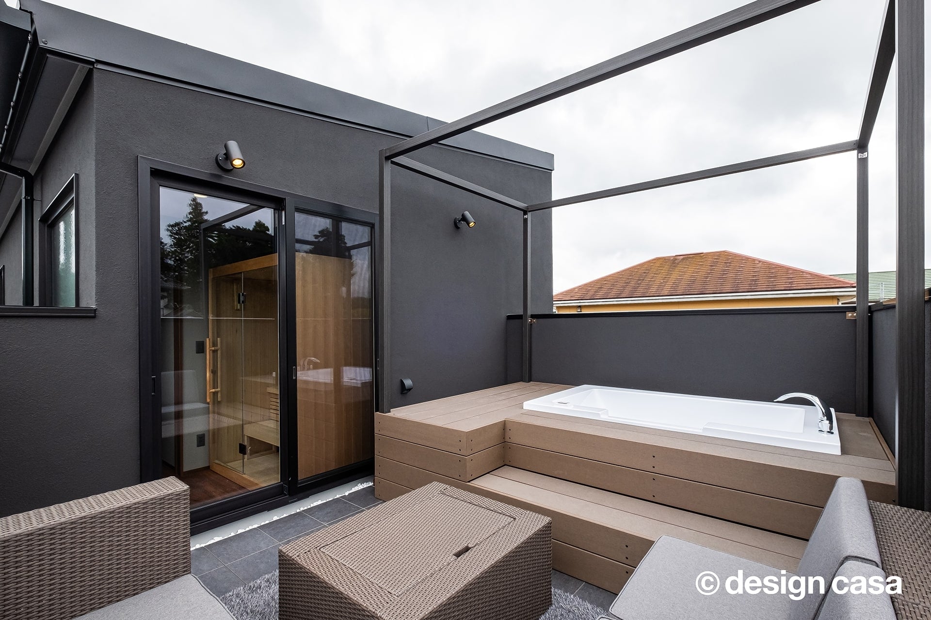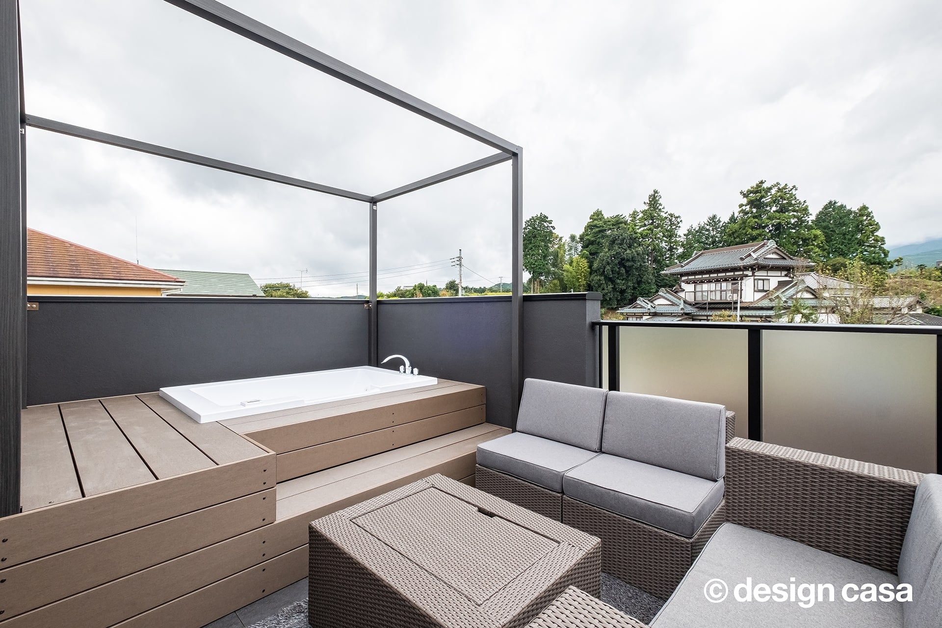 屋上には、屋外用ソファやデッキ、ジャグジーを備え、大人がくつろぎ遊ぶための場所を配置しました。空や景色を近くに感じながら過ごせるため、日常から少し離れた特別感を味わえるのが魅力です。非日常の時間を日常に取り込むため、建築家とともに眺望・動線・プライバシーのすべてを考慮しました。
