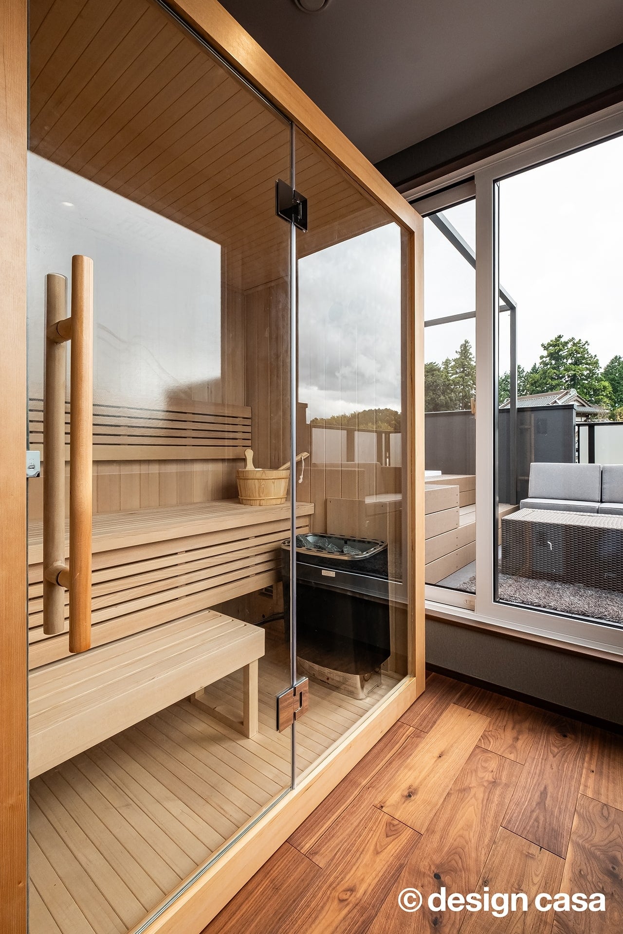 また、サウナスペースには、全面が透明な扉を採用しています。視線が抜けることで閉塞感がなく、室内にいながらも開放的な雰囲気を感じられるのが特徴です。外の景色や光を取り込みながら、リラックスした時間を過ごせます。