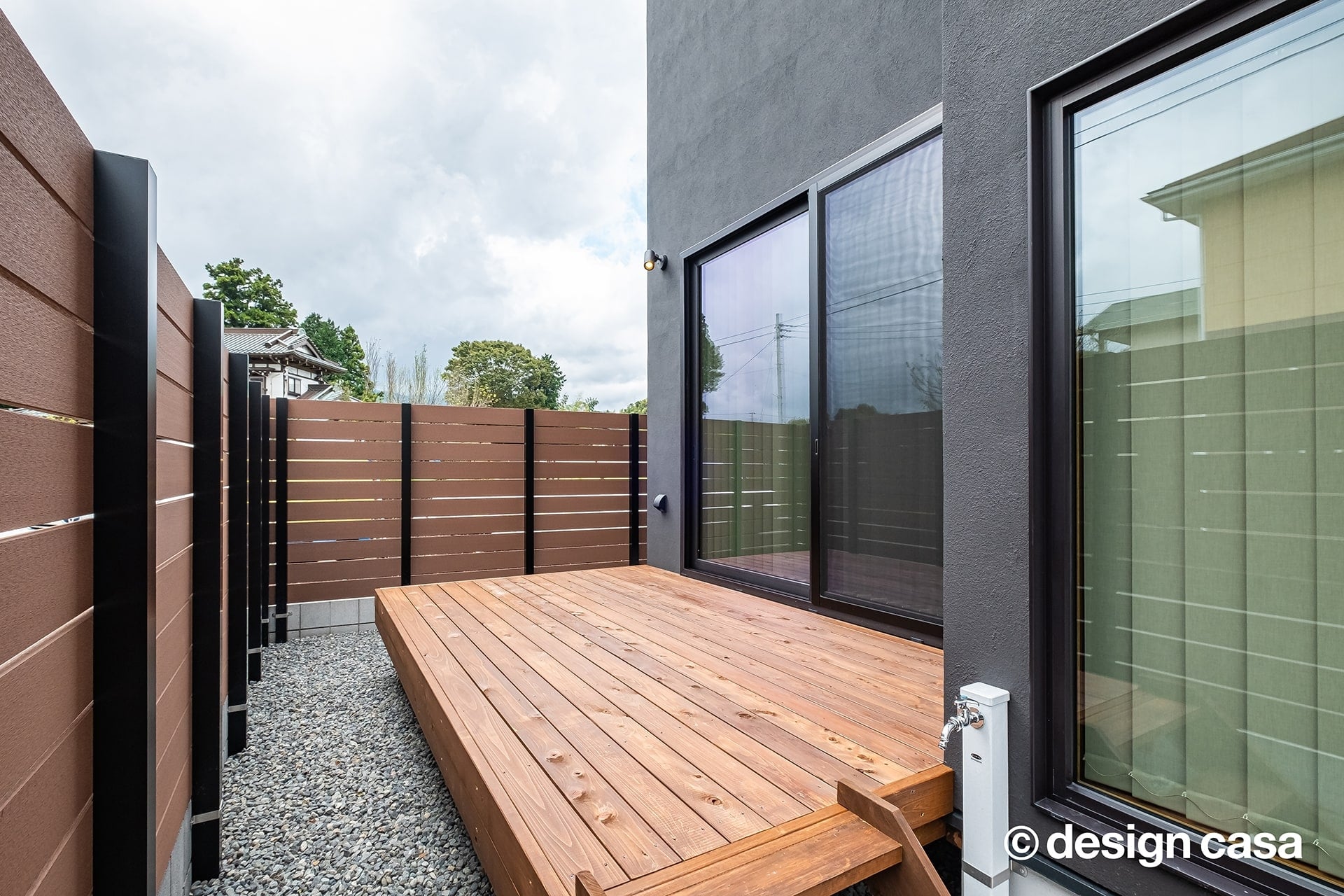 室内とゆるやかにつながるウッドデッキのバルコニーは、この住まいのもうひとつの居場所となる空間です。天気の良い日には、窓を開け放って風を通し、室内外が一体となった心地よさを味わえます。