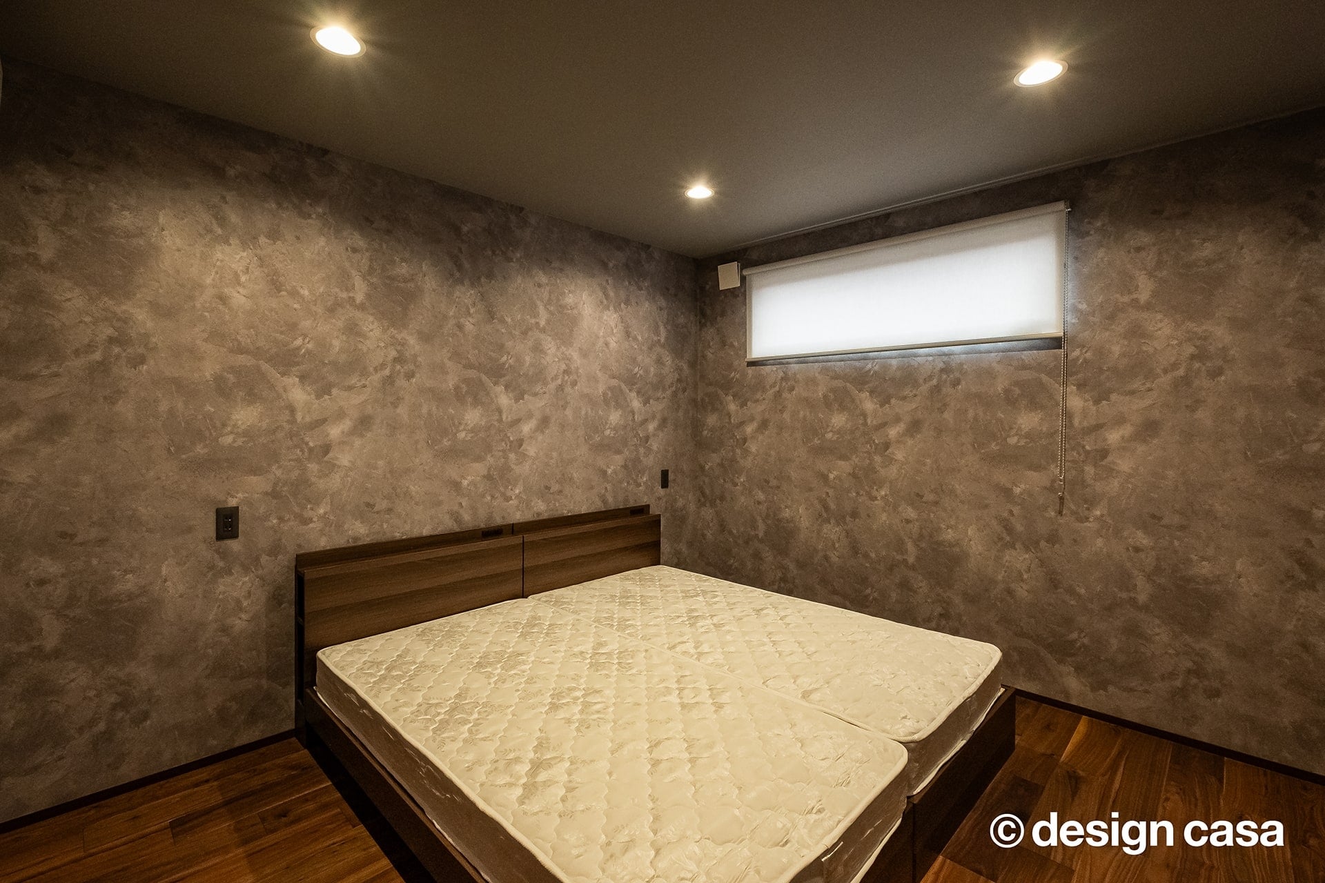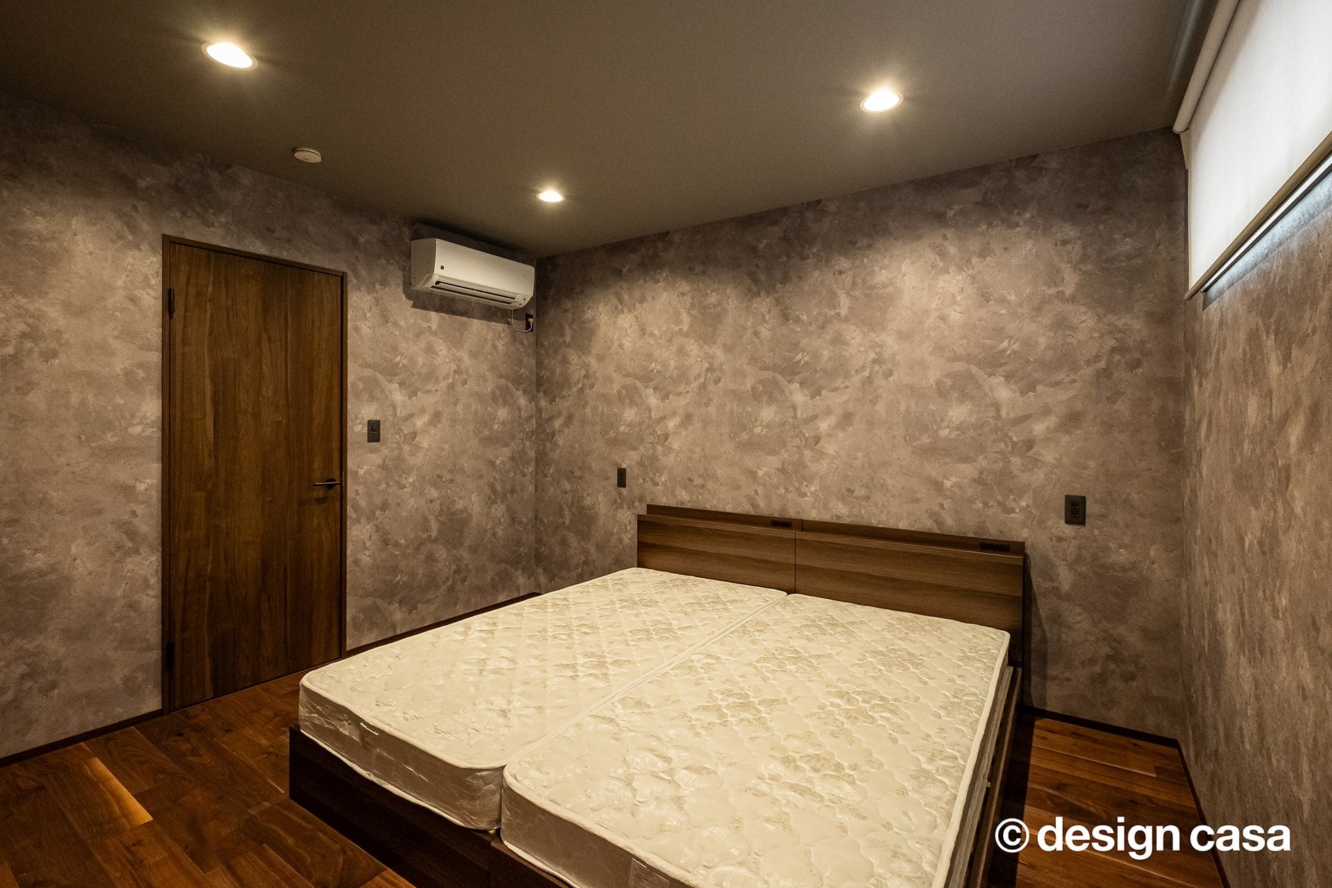 寝室は、1日の終わりに心と体を静かに整えるための空間です。そこで採用したのが、グレーの大理石調クロスです。派手すぎず、上質さを感じさせる素材感が、空間全体に落ち着きと洗練された印象を与えています。