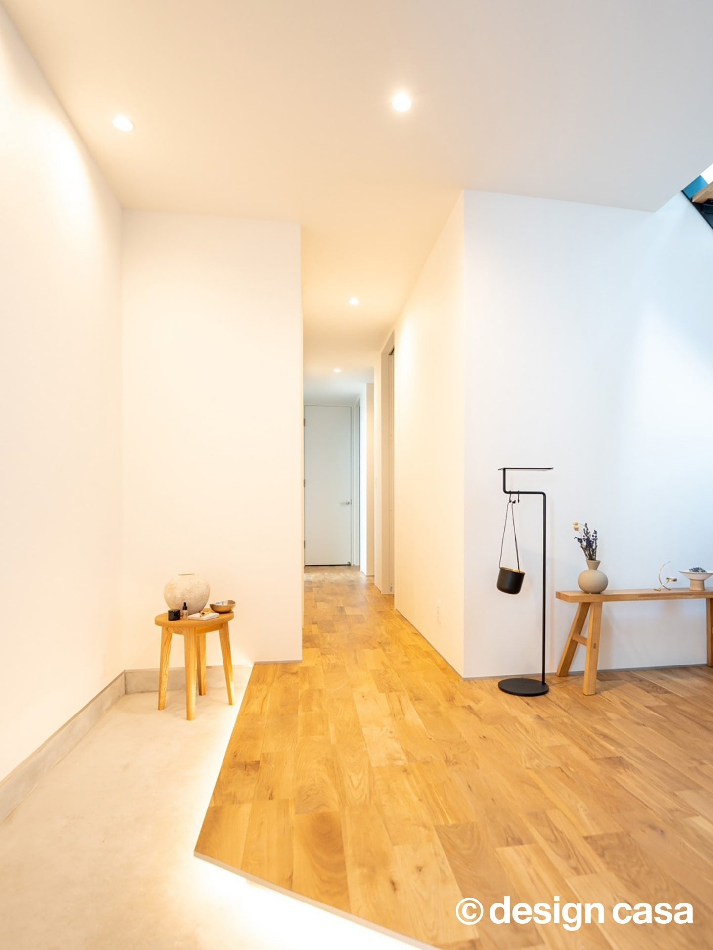 玄関に足を踏み入れると、段差部分に仕込まれたやわらかな間接照明が空間を包み込みます。視線を自然と下へ導く光の演出が、外から内へと気持ちを切り替え、ほっと落ち着ける雰囲気をつくり出しています。床には木目の美しさを感じられる素材を採用し、光と重なり合う温かみのあるデザインが魅力です。華美な演出に頼らず、素材の表情と光の使い方によって、静かな心地よさを感じられる玄関にしました。