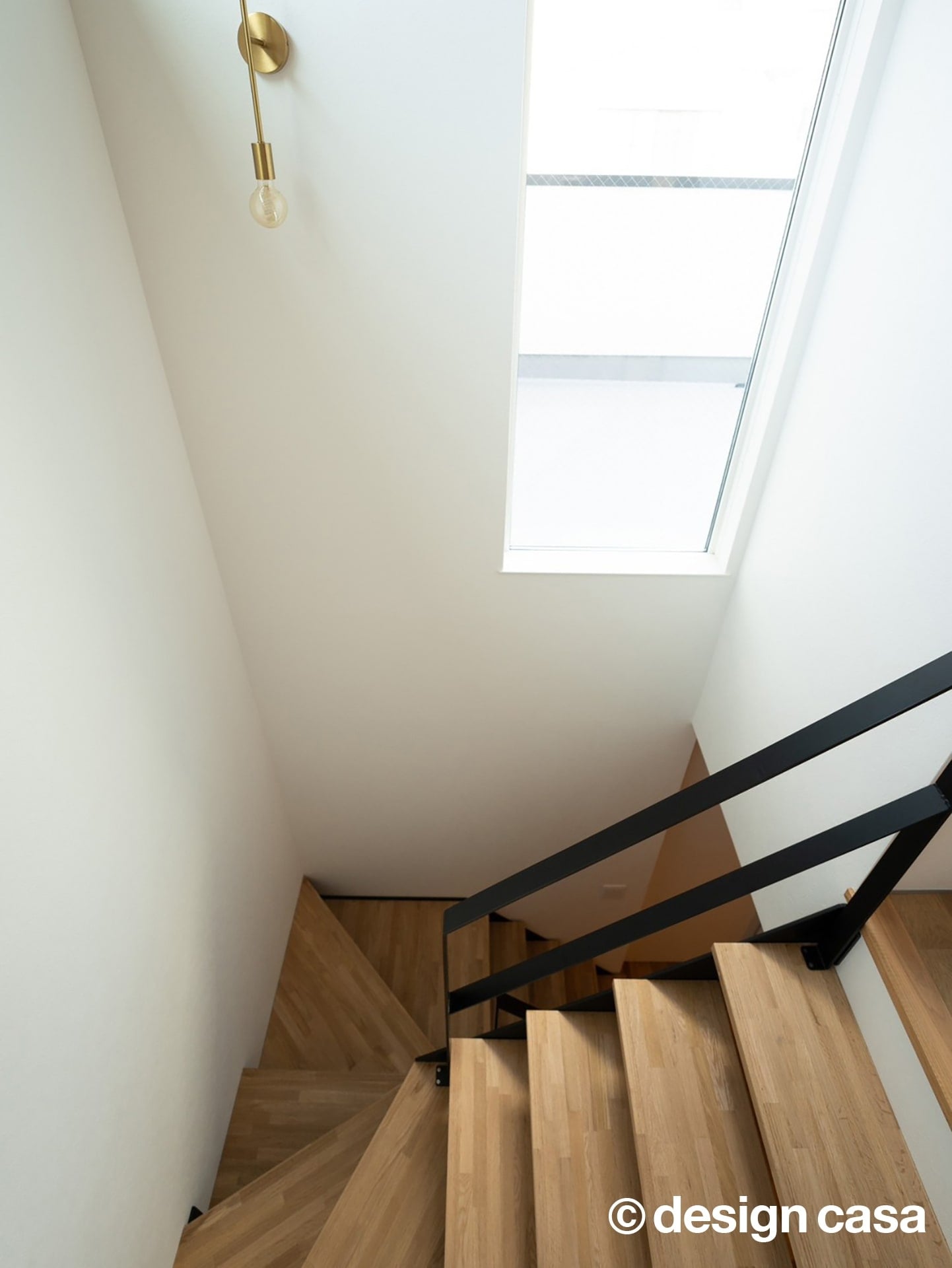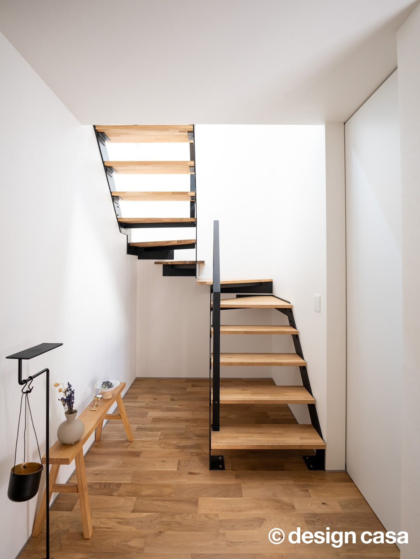 光と木が引き立て合う階段は、壁・天井を極力シンプルに抑えることで、階段そのものの存在感と素材の美しさが際立っています。踏板には木目の無垢材を用い、直線と斜めのラインを組み合わせたデザインが、視線にリズムと奥行きを与えます。また、トップライトから差し込む自然光が階段全体をやわらかく照らし、時間帯によって陰影が変化するのが魅力です。