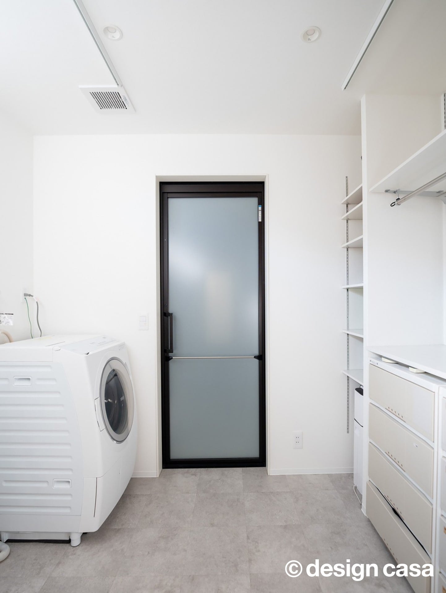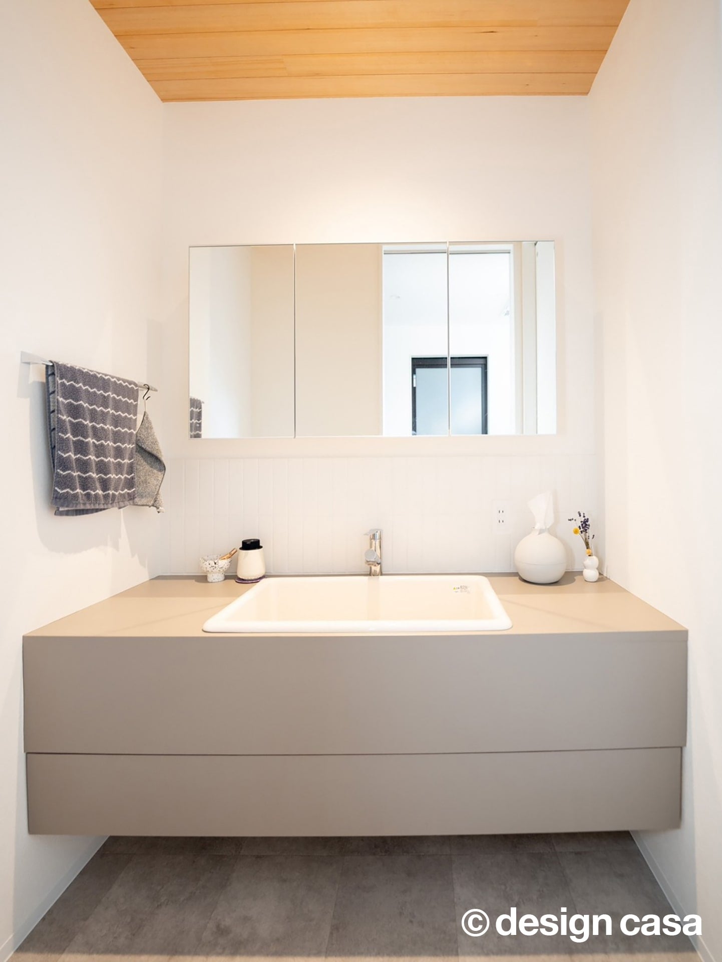 洗面・ランドリースペースは、白を基調とした仕上げにより、空間全体に清潔感が広がります。また、収納棚を壁面に集約し、動線を妨げない配置とすることで、日々の身支度や洗濯がスムーズに行えます。また、洗面スペースは、余計な要素を削ぎ落としたシンプルな構成が印象的です。壁・洗面カウンター・ミラーを同系色でまとめることで、空間全体に清潔感と広がりを感じさせます。